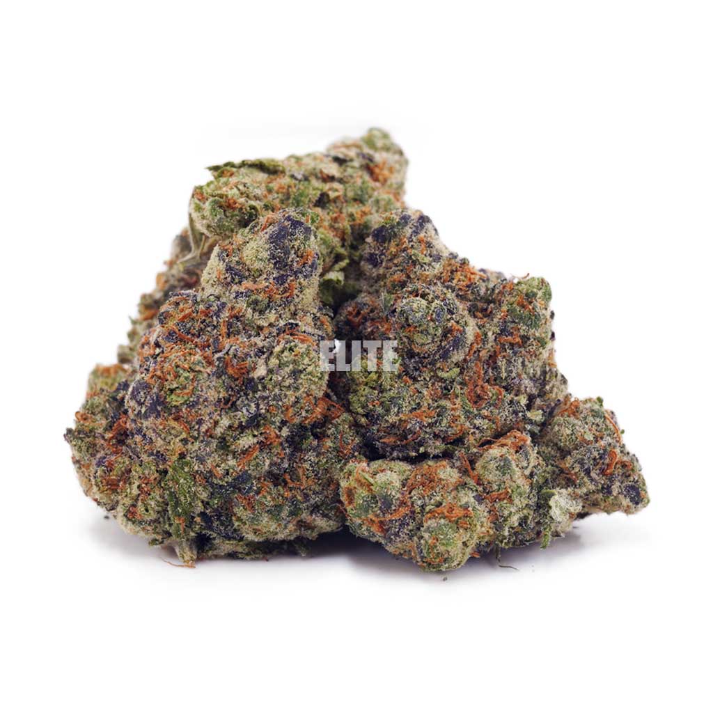 Gushers is a slightly indica dominant hybrid strain (60% indica/40% sativa) created through crossing the classic Gelato #41 X Triangle Kush strains. Named for the delicious candy, Gushers brings on the flavours with a combination of sour tropical fruits and rich creamy cookies in each and every toke. The aroma follows the same profile, although with a slightly herbal overtone and touches of spicy grape. The Gushers high isn’t quite as bright as the flavour, with super relaxing effects that are best suited for lazy nights spent at home with friends catching up on Netflix. The high starts with an influx of tingly euphoria that fills the back of the head with lightly arousing tingles. This quickly spreads throughout the rest of your body, leaving you pretty aroused and incredibly relaxed through and through. You won’t be sleepy in this state, but rather totally at ease with anything and everything happening around you. With these effects and its high 20-23% average THC level, Gushers is said to be perfect for treating chronic stress or anxiety, depression and chronic pain. This bud has elongated olive green nugs with bright green leaves, lots of thin amber hairs and a coating of tiny amber crystal trichomes.