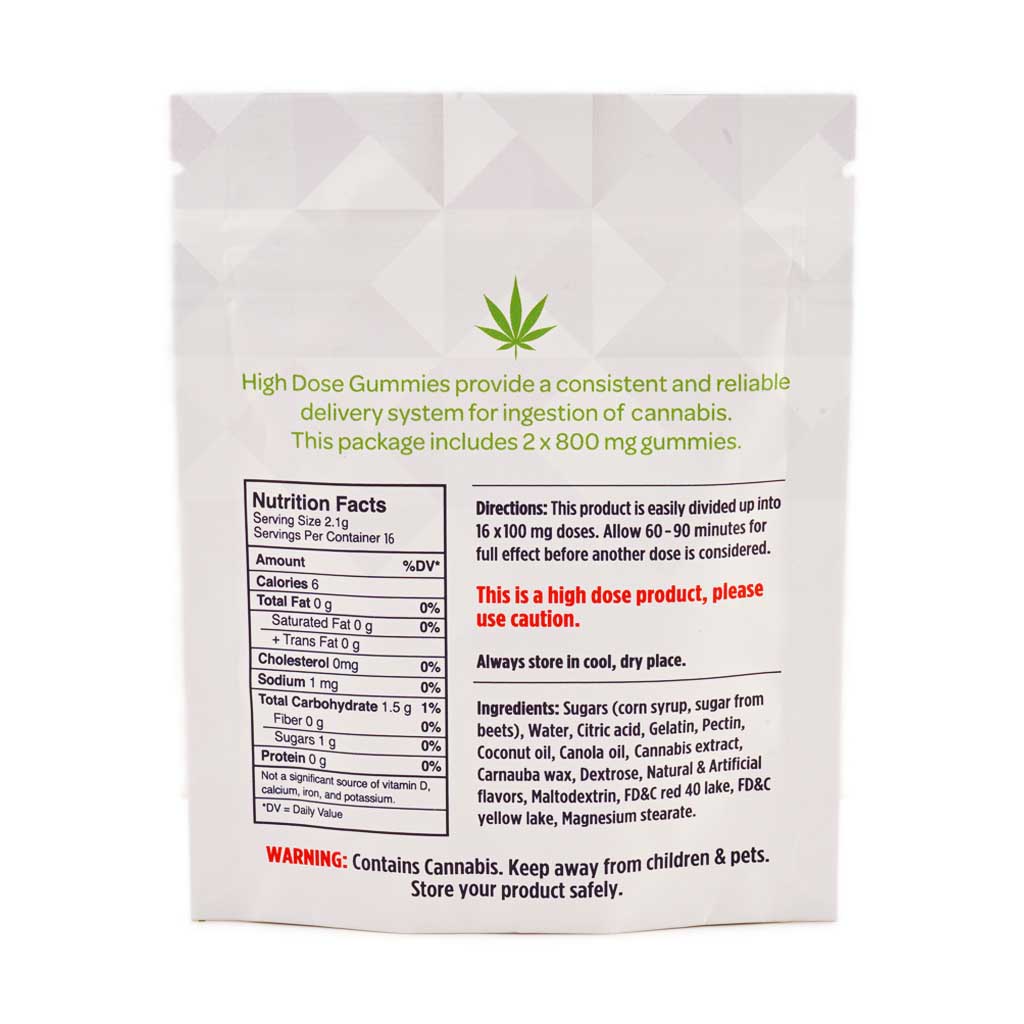 Dose: Each package contains 2x 800mg THC gummies that are easily divided into 100mg THC doses (1600mg THC per package).